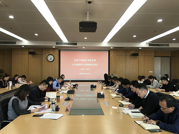 2019年12月27日下午,信息產(chan) 業(ye) 園公司黨(dang) 支部組織召開十九屆四中全會(hui) 精神宣講會(hui) ,公司全體(ti) 員工參加。