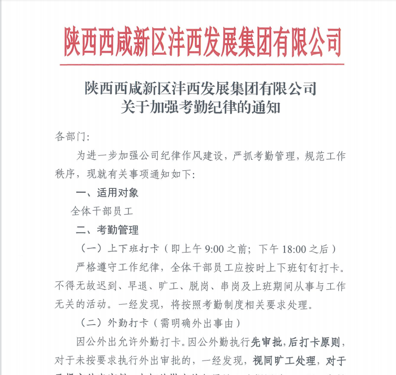 灃西發展針對作風散漫問題專(zhuan) 門製發通知,對紀律考勤、文風會(hui) 風、精神狀態等提出更高標準、更嚴(yan) 要求、更實舉(ju) 措,促進全體(ti) 幹部員工紀律作風持續向好。領導幹部帶頭以身作則、以上率下,幹部員工嚴(yan) 以律己、擔當作為(wei) ,自覺遵守各項規定製度,自覺抵製各種不正之風,積極踐行“勤快嚴(yan) 實精細廉”良好作風,以過硬工作作風和實幹實績譜寫(xie) 新時代高質量發展新篇章。