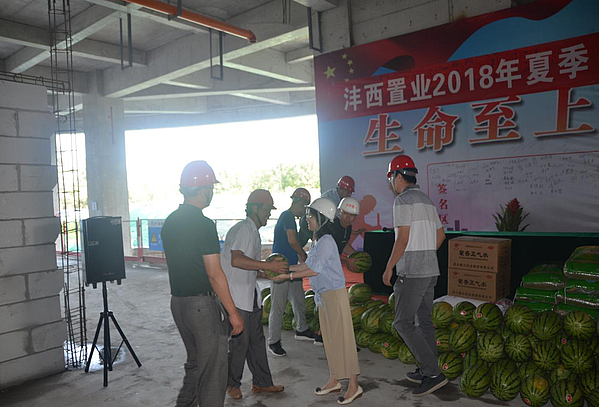 近期持續高溫,又正逢施工高峰期,為(wei) 落實公司以人為(wei) 本的管理理念,確保一線施工人員暑期施工安全,7月25日上午,陝西省灃西置業(ye) 有限公司開展2018年夏季“送清涼、促生產(chan) ”活動,為(wei) 公司在建項目送去防暑降溫品,把對施工人員的關(guan) 心關(guan) 懷送到項目一線。