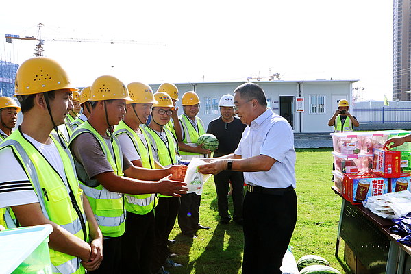 “為(wei) 了新城開發建設和民生福祉,大家不懼高溫,奮戰在項目一線,用辛勤的汗水保障了項目進度和工程質量,這一座座拔地而起的高樓大廈、寬曠明亮的教室無不凝結著大家的辛苦付出,你們(men) 是我們(men) 最美的建設者,向你們(men) 的辛勤付出表示衷心感謝和崇高的敬意。”薑勤發對高溫下的一線員工表示敬意。