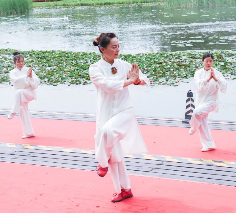 百餘(yu) 位武術、太極表演者身著古樸服裝,在柔和的背景音樂(le) 中舒緩起手,舒展身體(ti) ,於(yu) 動靜之中詮釋太極魅力,讓在場的觀眾(zhong) 感受到了中華民族傳(chuan) 統文化瑰寶太極的魅力。