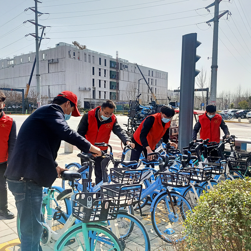 誌願者來到西部雲(yun) 穀一期東(dong) 南角,將隨意停放在路邊的共享單車進行了統一規範整理,集中搬至規定的區域停放。同時,積極引導群眾(zhong) 正確停放共享單車,並呼籲過往群眾(zhong) ,自覺愛護身邊的共享單車,做文明的騎行者、停放者、宣傳(chuan) 者。隨後,誌願者們(men) 手拿抹布和酒精噴壺, 仔細對共享單車的車身、車鎖、底板進行清潔。