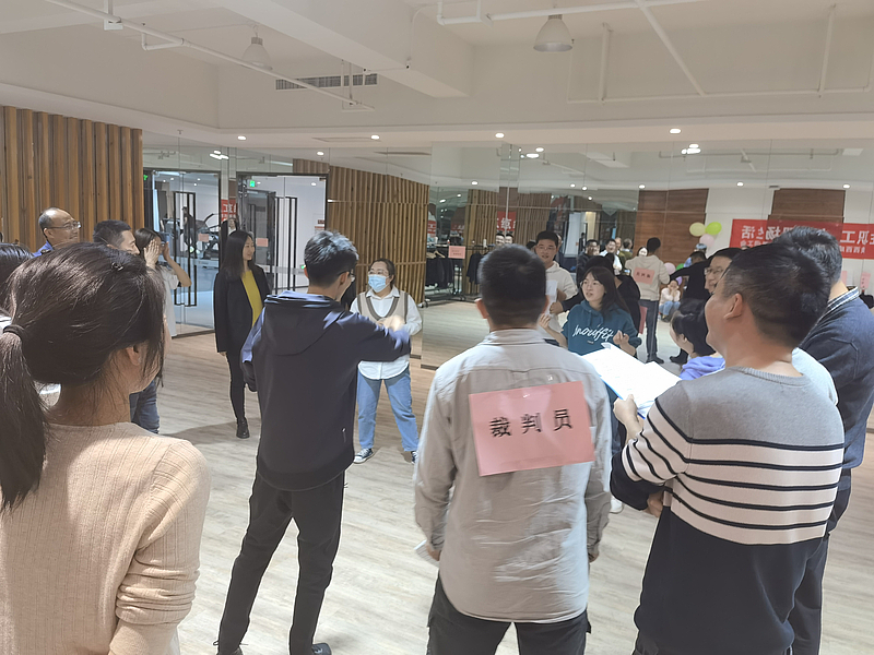 本次活動由女員工參賽,男員工擔任裁判員及後備隊員,活動分為(wei) 個(ge) 人賽和團體(ti) 賽,各包含兩(liang) 個(ge) 項目。通過計時跳繩、踢毽子等個(ge) 人項目,模仿競猜、穿針引線等團體(ti) 項目,既鍛煉員工體(ti) 力,又趣味十足,參賽者們(men) 個(ge) 個(ge) 不甘示弱,鬥誌昂揚,熱情高漲,現場氣氛熱烈,歡聲笑語此起彼伏,全體(ti) 幹部員工充分體(ti) 驗到競賽的緊張、活動的趣味、團隊的溫暖。