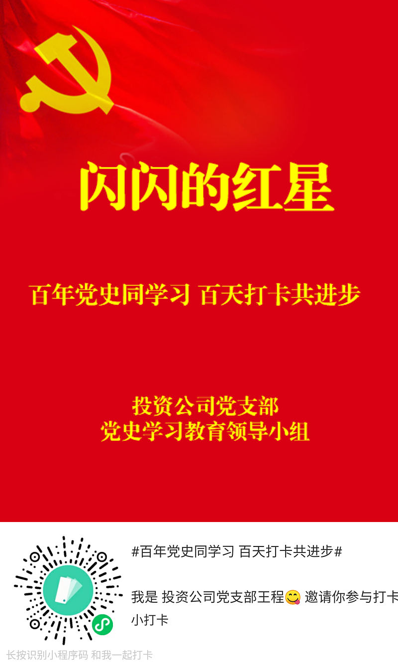 米兰体育彩票官网投資公司黨(dang) 支部號召青年黨(dang) 員團員:與(yu) 我們(men) 一同,堅持百天紅色打卡,走近建黨(dang) 百年的偉(wei) 大征程,感悟中華兒(er) 女的宏偉(wei) 史詩。