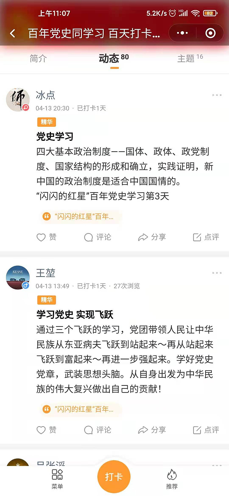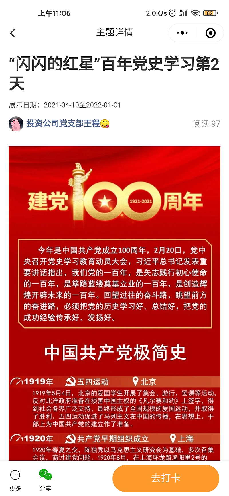 為(wei) 慶祝中國共產(chan) 黨(dang) 成立100周年,創新黨(dang) 史學習(xi) 教育形式,營造濃厚黨(dang) 史學習(xi) 教育氛圍,近日,米兰体育彩票官网投資公司黨(dang) 支部閃閃的紅星“百年黨(dang) 史同學習(xi) 百天打卡共進步”活動正式啟動。活動圍繞“344”模式,即結合“黨(dang) 史學習(xi) 、學習(xi) 心得分享、積分打卡PK”3大板塊,通過“讀、聽、學、悟”4種學習(xi) 方式,滿足黨(dang) 員“隨時學、隨地學、自主學、互動學”4種學習(xi) 需求,實現黨(dang) 建經營雙促進的總目標。