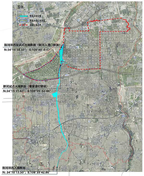 由於(yu) 新河及其支流河道沿途村莊、企業(ye) 較多,生活汙水、企業(ye) 及畜禽養(yang) 殖廢水大量直排,河底淤泥堆積、水流較緩,加之水體(ti) 自淨能力差,引發黑臭。2016年監測顯示,新河整體(ti) 表觀質量較差,進入西鹹新區灃西新城前已明顯黑臭,主要超標指標為(wei) 透明度、氨氮、ORP,等級為(wei) 輕度黑臭。