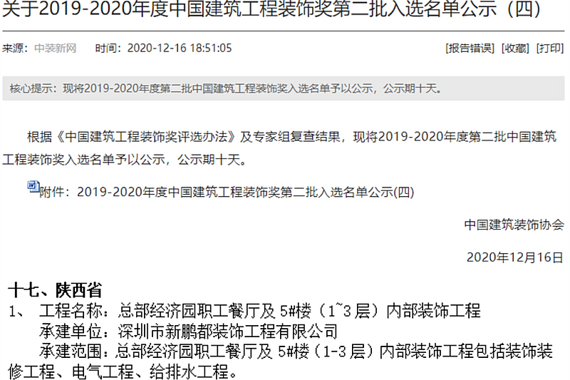 2020年,置業(ye) 公司灃西國際大廈機電安裝工程項目榮獲中國安裝工程優(you) 質獎(中國安裝之星)、總部經濟園職工餐廳及5#樓內(nei) 部裝飾工程榮獲中國建築工程裝飾獎。
