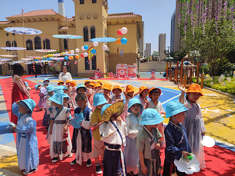 繽紛夏日,精彩六一。灃西第七幼兒(er) 園的“古風遊園會(hui) ”也開始了,孩子們(men) 都穿著漢服在“集市”裏“購物”,有粽子、團扇、糖葫蘆等等,物業(ye) 校區項目還貼心地為(wei) 孩子們(men) 準備了可愛的遮陽帽,遠遠望去也是一道可愛的風景線。