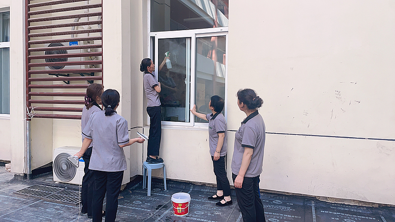 學校麵積大、開學時間緊迫、衛生死角多……重重困難給拓荒工作帶來了極大考驗,灃西服務工作人員不畏艱辛,發揚團隊作戰精神,從(cong) 地麵到牆體(ti) 、桌椅到櫃腳......繁忙而有序地清潔著校園的每一個(ge) 角落,紮實做好新學期開學各項準備工作。