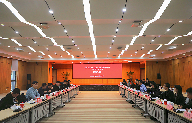 隨後雙方召開座談會(hui) ,西鹹信息產(chan) 業(ye) 園董事長溫權對商會(hui) 來訪表示熱烈歡迎,雙方就各自發展情況及戰略規劃進行了深入交流,活動同時邀請了園區入駐的優(you) 秀企業(ye) 代表,為(wei) 雙方搭建起了交流合作平台。