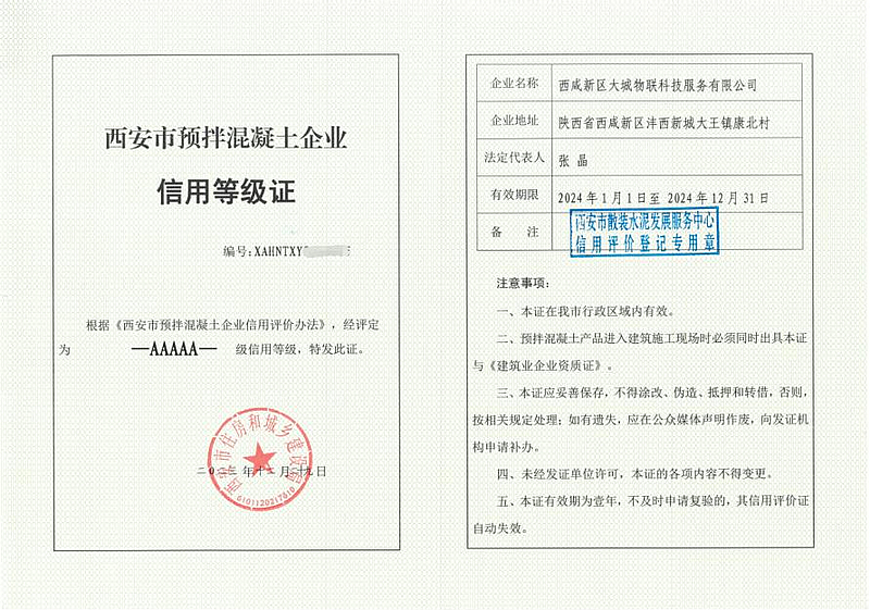 獲評西安市預拌混凝土企業(ye) “5A”信用等級