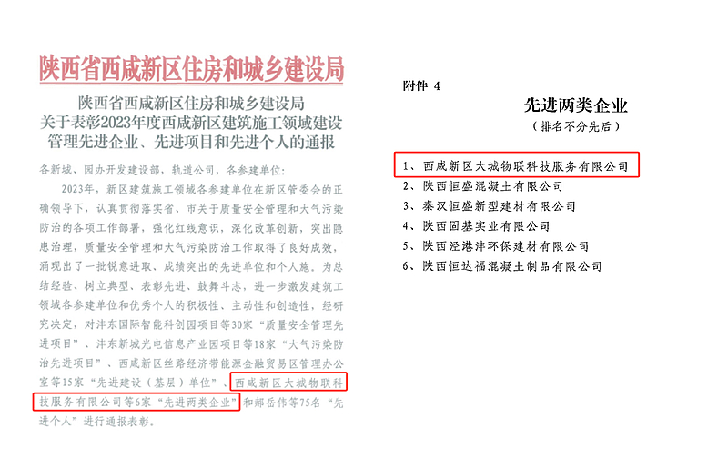 在2023年度西鹹新區建築施工領域先進表彰中,大城公司榮獲“先進兩(liang) 類企業(ye) ”榮譽稱號。今年以來,大城公司重點加強內(nei) 部管理提升,優(you) 化原材把控、質量管理、供應跟蹤等多個(ge) 業(ye) 務環節,提升整體(ti) 服務水平。服務再加碼的同時,將安全、環保工作一手抓,不斷改進環保管理措施,守好安全環保管理紅線,持續發揮行業(ye) 引領作用。