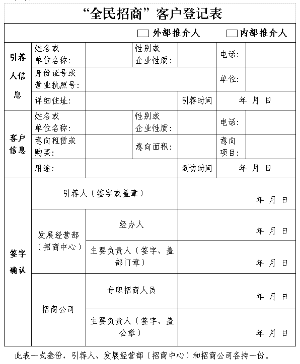(三)客戶首次到訪,引薦人要與(yu) 客戶同時到場,招商公司和專(zhuan) 職招商人員需在《“全民招商”客戶登記表》簽字蓋章確認客戶為(wei) 首訪。