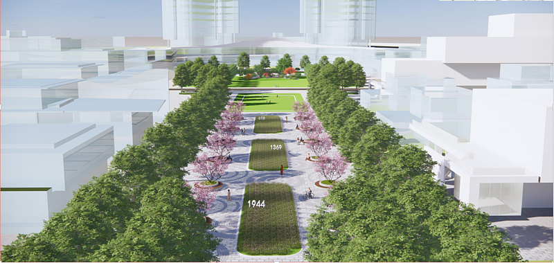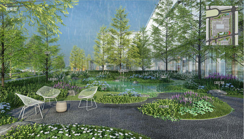 園區內(nei) 以簡潔的複層種植為(wei) 主,堅持生態性,注重特殊性,考慮季相性,打造四季怡人的生態環境。采用區域喬(qiao) 木陣列式種植,形成規則種植形式;局部運用開花地被,形成簡潔飄逸的商業(ye) 景觀空間;部分區域栽植草花地被,點綴銀杏,增加季相變化效果,形成視覺焦點。