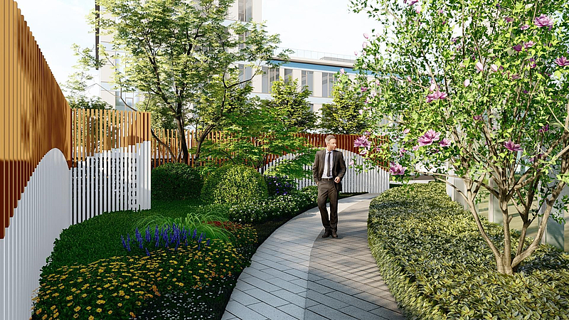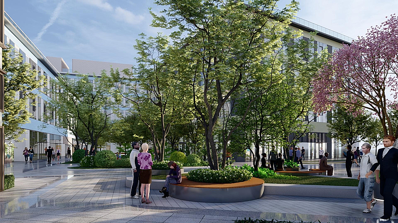 在園區內(nei) 打造中央景觀軸,並沿中軸線布置出別具一格的綠色共享空間,將園區內(nei) 多處主景和次景串聯,增強景觀空間的整體(ti) 性,豐(feng) 富建築空間的視覺感受,形成建築與(yu) 園林相融合的景觀境界,使建築景觀更加精致典雅。