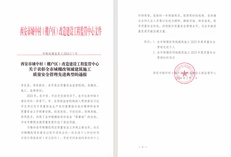 近日,西安市城中村(棚戶區)改造建設工程監管中心發布了《關(guan) 於(yu) 表彰全市城棚改領域建築施工質量安全管理先進典型的通報》,米兰体育彩票官网建設的江渡新苑南區項目獲評“全市城棚改領域建築施工2023年度質量安全管理標杆項目”榮譽稱號。