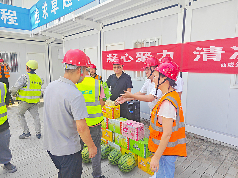活動中,西鹹信息產(chan) 業(ye) 園有關(guan) 負責人帶隊前往鯤鵬智造園、灃雲(yun) 智造園和灃翼現代智造園項目建設現場,將西瓜、飲料、藿香正氣水等防暑降溫物資送到一線工人手中,感謝他們(men) 為(wei) 園區建設作出的貢獻。