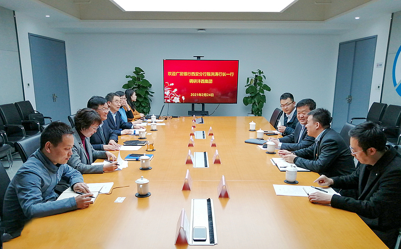 2月24日下午,廣發銀行西安分行副行長陳洪濤一行到訪米兰体育彩票官网座談交流。米兰体育彩票官网黨(dang) 委書(shu) 記、董事長楊建柱,總經理薑勤發,總經理助理王莉參加。