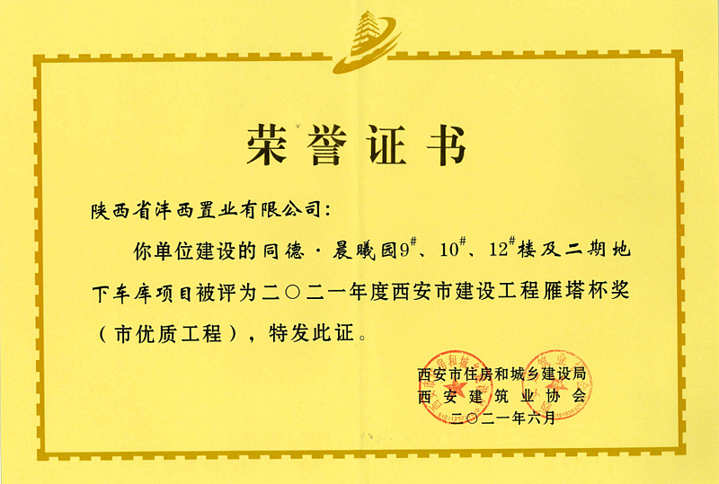 同德·晨曦園9#、10#、12#樓及地下車庫項目先後通過陝西省文明工地、陝西省建築業(ye) 綠色施工示範工程、陝西省新技術應用示範工程、陝西省優(you) 質結構工程評選;先後榮獲西安市建設工程“雁塔杯”、陝西省優(you) 質工程“長安杯”獎等多項榮譽。