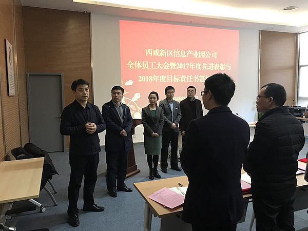 2月22日下午,信息產(chan) 業(ye) 園公司舉(ju) 行全體(ti) 員工大會(hui) 暨2017年先進表彰與(yu) 2018年度目標責任書(shu) 簽訂儀(yi) 式。