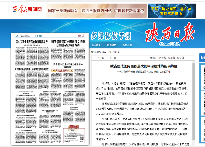 2013年,灃西新城開始中深層地熱能無幹擾清潔供熱技術試點。2018年1月,灃西新城舉(ju) 辦無幹擾地熱供熱技術論證會(hui) ,參會(hui) 的中國工程院院士、國家能源委員會(hui) 專(zhuan) 家谘詢委員江億(yi) 認為(wei) ,該技術比傳(chuan) 統淺層地熱能熱泵技術節能30%以上,無汙染、清潔、高效、可持續利用。2019年11月,灃西新城建成全國最大規模中深層地熱能無幹擾清潔供熱技術項目,可為(wei) 中國西部科技創新港159萬(wan) 平方米的建築供熱、供冷、供生活熱水。2020年5月,灃西新城能源公司在河南鄭東(dong) 新區規劃實施清潔供能麵積2000萬(wan) 平方米;今年7月,他們(men) 又中標北京城市副中心綜合交通樞紐中深層地熱項目,為(wei) 亞(ya) 洲最大的地下綜合交通樞紐提供清潔能源服務。