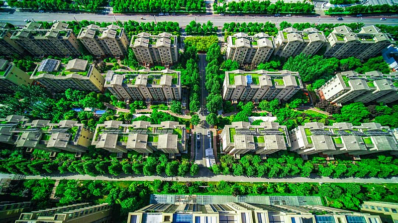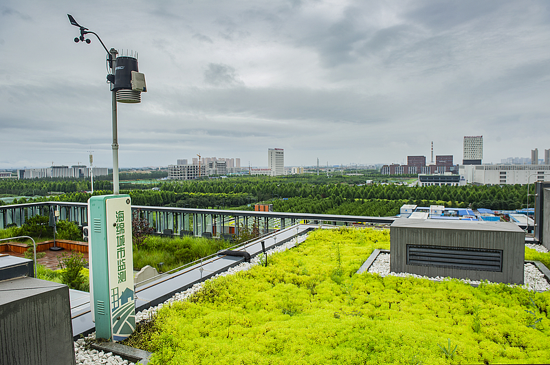 九月秋高氣爽,站在灃西新城的一棟大樓頂層放眼望去,記者被眼前的一幕深深震撼。很多大樓原本色彩單一的樓頂,生機盎然,各種綠植長勢旺盛,花卉五彩繽紛。據悉,屋頂花園通過種植佛甲草、景天、馬藺等耐旱耐澇、適應性強的植物品種,使雨水被土壤介質和植物根係充分吸收,從(cong) 而起到滯留、吸收、淨化雨水,減少城市內(nei) 澇的作用。而同時,滯蓄的雨水,也為(wei) 大樓周邊區域的植物澆灌、道路衝(chong) 洗、景觀用水等提供部分水源。
