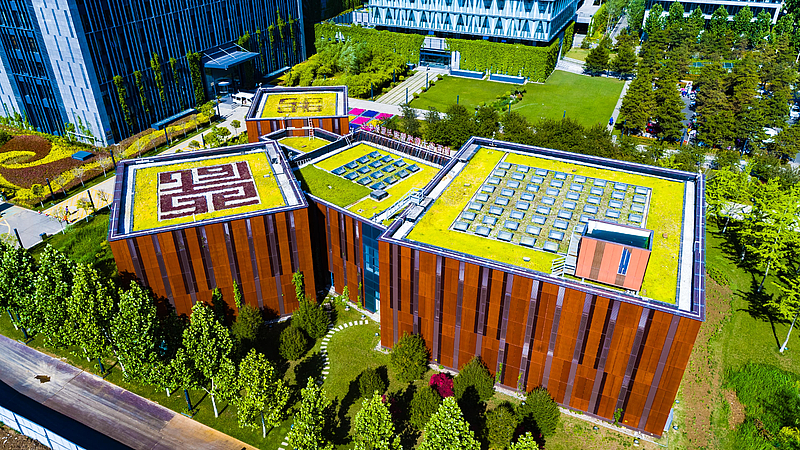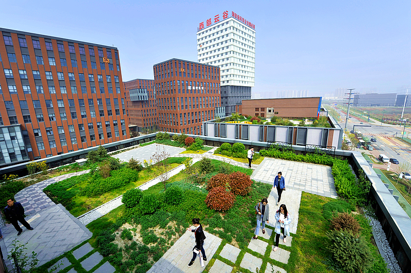 “上樓去散散步吧。”在快節奏的現代社會(hui) ,很多被困於(yu) 城市寫(xie) 字樓內(nei) 的白領,每天工作間歇最大的奢望,便是下樓找一塊綠地放鬆放鬆。然而,在灃西新城西部雲(yun) 穀,白領們(men) 隻需移步樓頂,便能瞬間完成辦公室到公園的無縫切換。作為(wei) 建設海綿城市的重要探索,近年來,灃西新城部分園區辦公樓上建設了綠色屋頂。屋頂花園不僅(jin) 能起到吸收、淨化雨水的作用,同時還能有效減碳吸碳,降霾去熱,成為(wei) 城市一道稀有景觀。