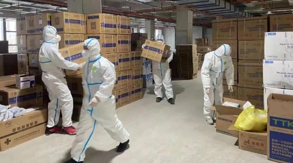 一箱箱口罩、防護服、消毒液、酒精、防護麵罩等醫療物資碼放得整整齊齊;網絡交換機、讀卡器、桌椅、照明設施、隔離樁等也分門別類按次排開……這裏是灃西新城疫情防控“彈藥庫”。