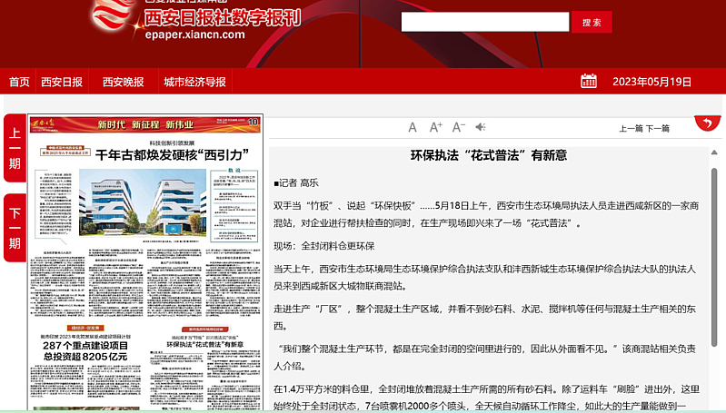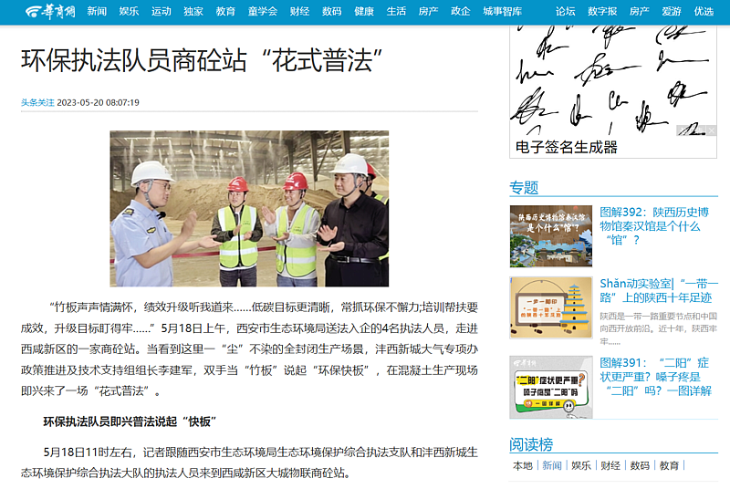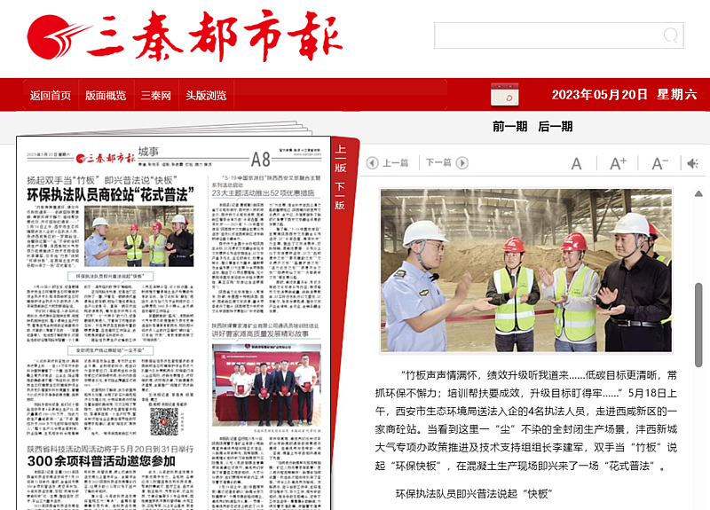 “竹板聲聲情滿懷,績效升級聽我道來……低碳目標更清晰,常抓環保不懈力;培訓幫扶要成效,升級目標盯得牢……”5月18日上午,西安市生態環境局送法入企的4名執法人員,走進西鹹新區的一家商砼站。當看到這裏一“塵”不染的全封閉生產(chan) 場景,灃西新城大氣專(zhuan) 項辦政策推進及技術支持組組長李建軍(jun) ,雙手當“竹板”說起“環保快板”,在混凝土生產(chan) 現場即興(xing) 來了一場“花式普法”。