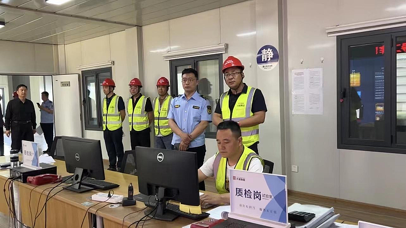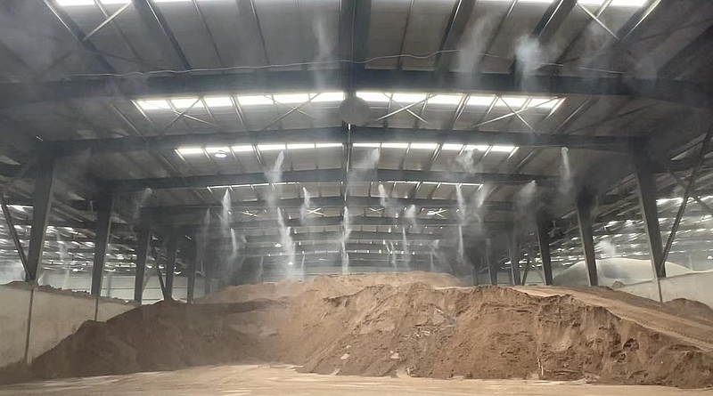 商砼站負責生產(chan) 運輸的工作人員王澤坤介紹,這個(ge) 料倉(cang) 裏,全封閉堆放著混凝土生產(chan) 所需的所有砂石料。除了運料車“刷臉”進出外,此處始終處於(yu) 全封閉狀態,7台噴霧機2000多個(ge) 噴頭,全天候自動循環工作降塵……