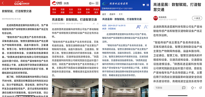 走進陝西高速星展科技有限公司生產(chan) 基地智能傳(chuan) 感產(chan) 線和智慧交通物聯設備產(chan) 線正在有序運轉。“智能傳(chuan) 感產(chan) 線主要生產(chan) 各類傳(chuan) 感設備、采集和通訊設備,智慧交通物聯設備產(chan) 線主要生產(chan) 物聯網傳(chuan) 感器,涵蓋車路協同、衛星通信、智慧工地、智慧交通相關(guan) 的環境感知設備、交通流感知設備、交通基礎設施建模設備。”陝西高速星展科技有限公司研究院副總監趙杉盟介紹說,目前生產(chan) 基地每年生產(chan) 各類傳(chuan) 感器上千套,主要應用於(yu) 陝西省交通強國秦嶺隧道安全防控體(ti) 係建設項目、青藏線道岔監測係統等項目。