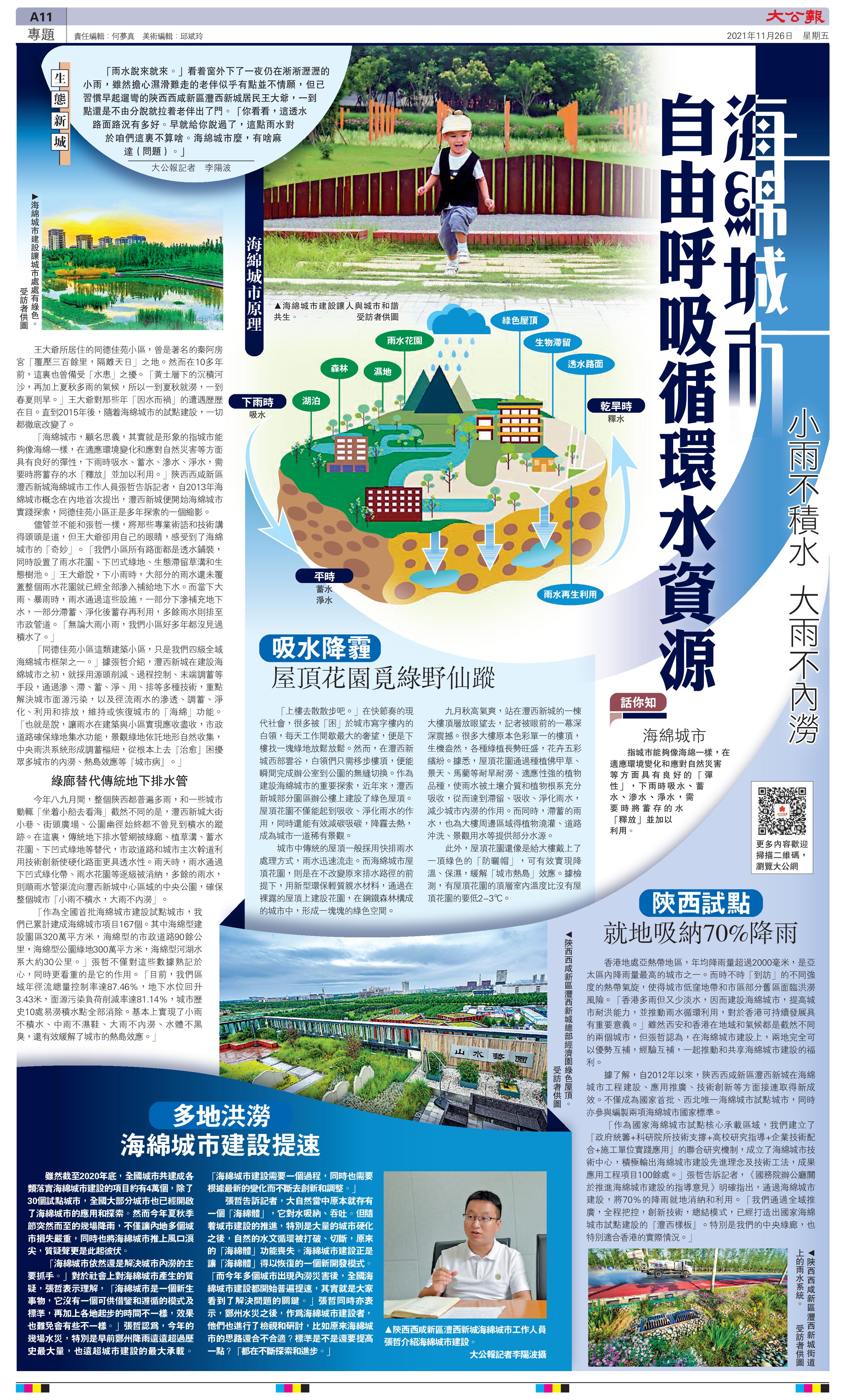 近日香港大公報刊發《海綿城市自由呼吸循環水資源》點讚灃西新城海綿城市建設全文如下海綿城市會(hui) “呼吸”內(nei) 澇災害將遠離今年夏秋季節,內(nei) 地多個(ge) 城市遭遇曆史罕見降雨,特別是很多北方內(nei) 陸城市居民,麵對“水漫大街”的場景,更是感觸頗多。“香港多雨但又少淡水,因而建設海綿城市,提高城市耐洪能力,並推動雨水循環利用,對於(yu) 香港可持續發展具有重要意義(yi) 。